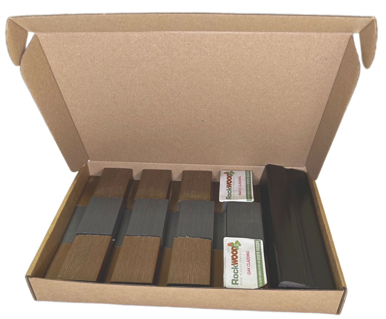 This Sample Box contains 3 x 60mm lengths of WPC Wall Cladding in Oak, Maple, and Stone Grey colours.